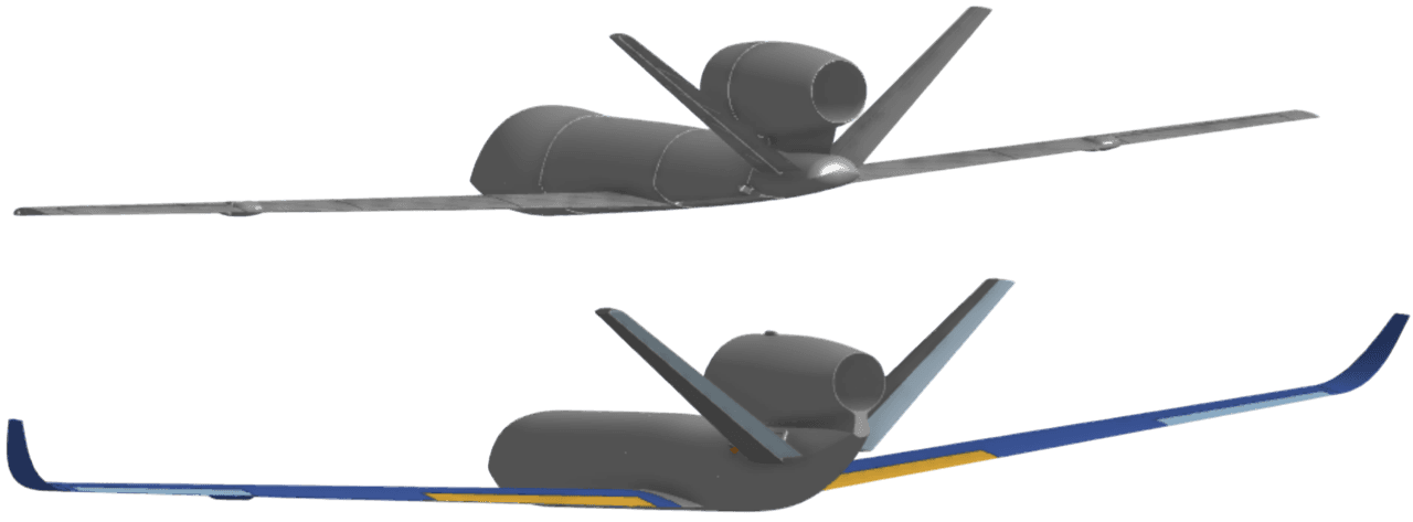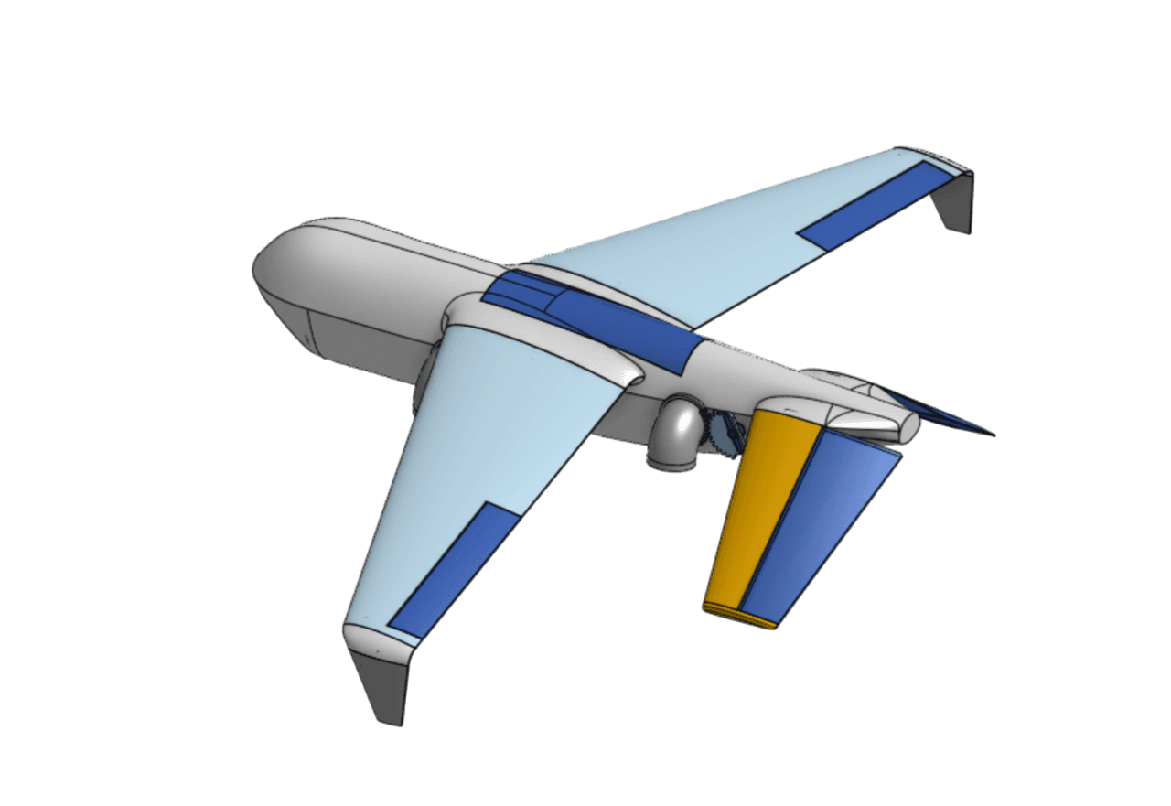 The airframe was intended to be one of two airframes, designed for a future integration. The “H” variant would be VTOL, the “C” would exclusively be CTOL. With a 150 cm / 59 in wingspan (excluding winglets), the aircraft was designed to have increased thrust and a reduced projected frontal area than the prior BLZN-1, incorporating all the manufacturing and structural best-practices since learned, in tandem with complete CFD validation prior to manufacturing. Contrasted with BLZN-1, the aircraft had a higher aspect ratio v-tail, a longer rear-EDF nacelle, a more efficient wing airfoil, winglets and no camera gimbal for reduced drag, large flaps, and superior landing gear structures (& landing gear doors). CFD was employed to optimize the angle of incidence, flap sizing and maximum deflection, winglet shaping, and trim flight angles for the ruddervators.