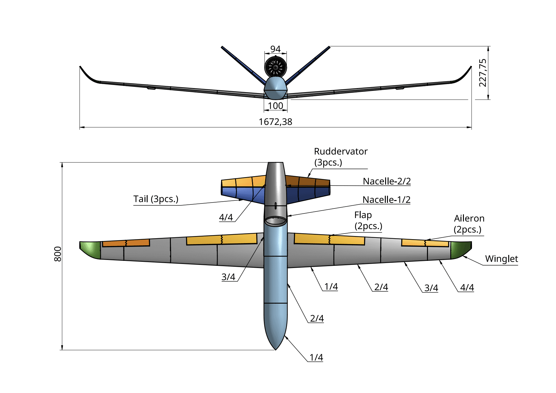 The fifth design is an attempt to methodically integrate both prior lessons and novel techniques into the aircraft. Its wingspan will remain equivalent to BLZN-C4’s (150 cm / 59 in), while bringing upgrades such as slotted flaps and split winglets. For hybrid VTOL/CTOL capabilities, an inverted tri-copter layout (with the two rear EDFs tilting) was chosen, with thrust-vectored EDFs (two external and one internal, a decision informed by the inefficacy of internal ducting seen in BLZN-2 & BLZN-3). FEA analysis will be conducted and compared with real-world deflection tests, to allow the design to best utilize advanced materials such as PET-CF for load-bearing frame components, and special PLA or ASA variants for aircraft skin and fine mechanical components. The approach to internal structures is completely distinct to any previous iteration, comprising a full carbon-fiber frame and topology-optimized structures for skin ribs. A complete CFD analysis will dictate design changes to ensure dynamic stability and control-surface authority, in addition to static stability analyses performed as with BLZN-C4.