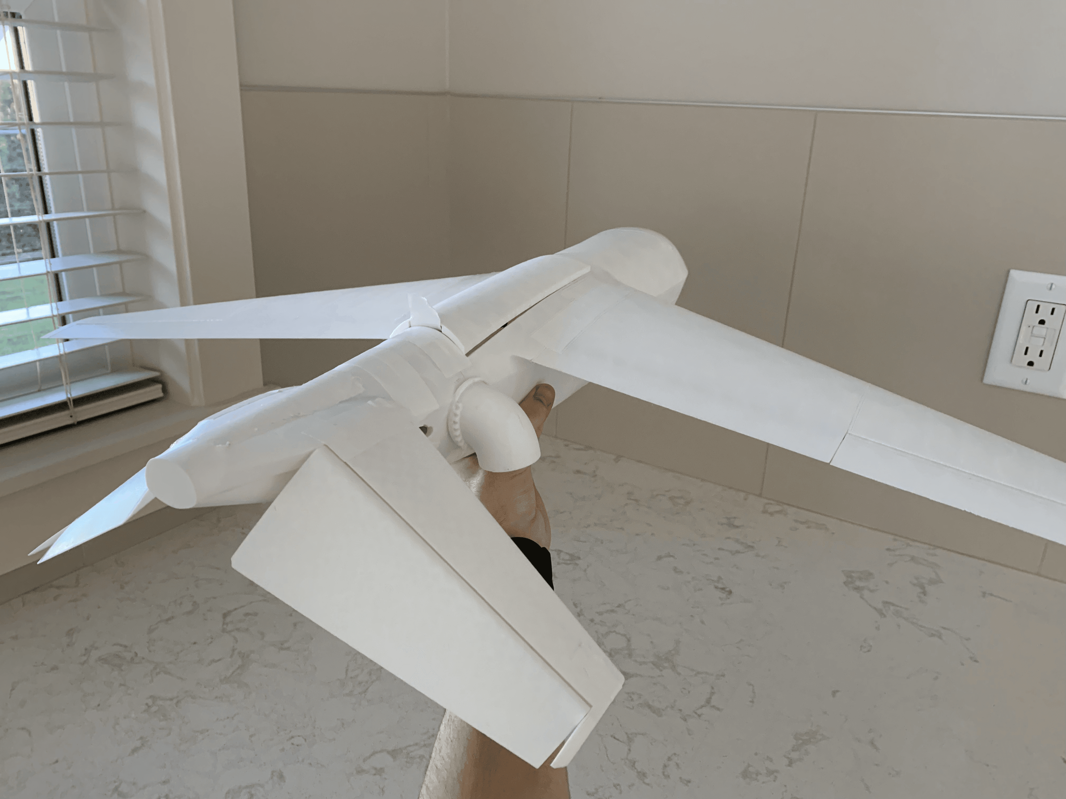 The first attempt had a relatively simple fixed-wing architecture, with a 150 cm / 59 in wingspan. A single, 70 mm rear EDF mounted between a v-tail would propel the aircraft, which had retractable landing gear and a dual-axis camera gimbal. The airframe was fully printed out of PLA filament, with thin carbon-fiber spars running through the wings, and a thick shell for rigidity.